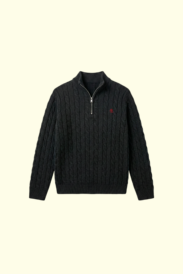 Premium cable knit half-zip sweater designed for modern streetwear. Clean, timeless design with a subtle embroidered detail, perfect for everyday wear and elevated casual looks.